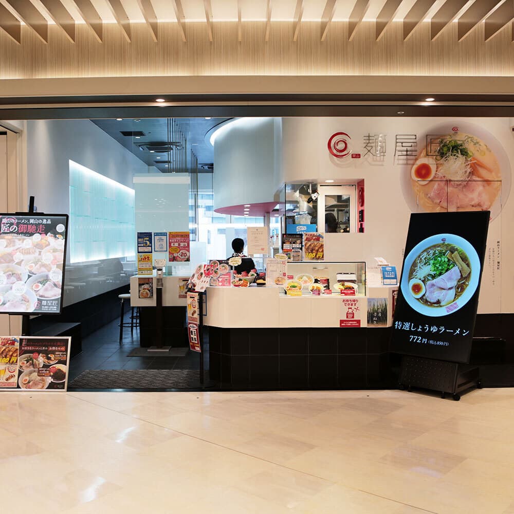 ご利用しやすいJR岡山駅内さんすての一画に店舗を構える『麺屋匠』は、女性一人でもお気軽にご利用いただけるスタイリッシュでカジュアルな店舗です。
