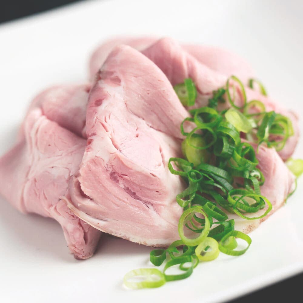 上品な味わい、柔らかさ、旨味に定評があるブランド豚「岡山産ピーチポーク」を低温調理でじっくりと焼き上げることで、たくみ独自の断面がほのかな桃色でとろけるような食感の美味しいチャーシューとなります。たくみ、塩、醤油、全てのラーメンのスープと相性の良い自慢のチャーシューです。